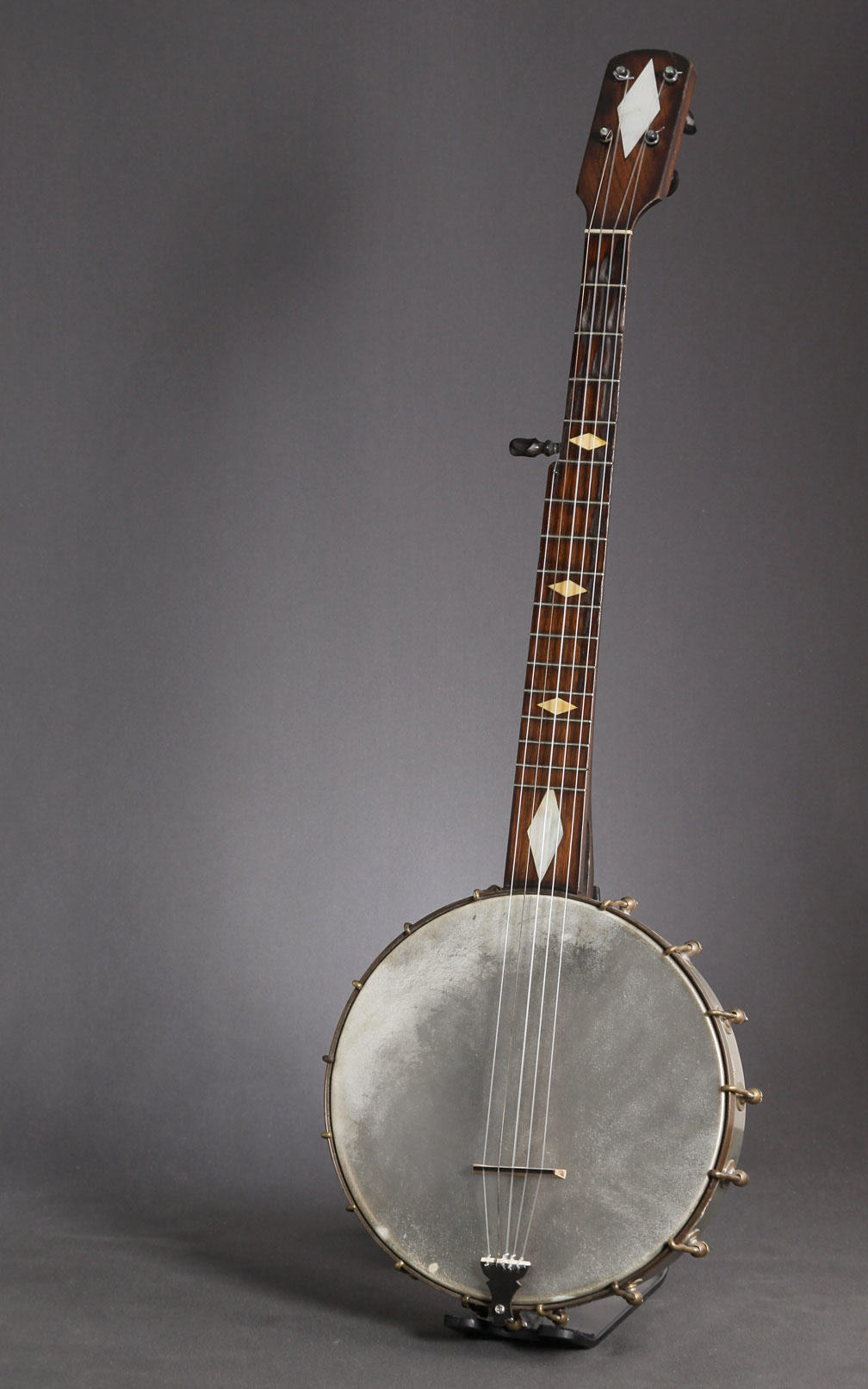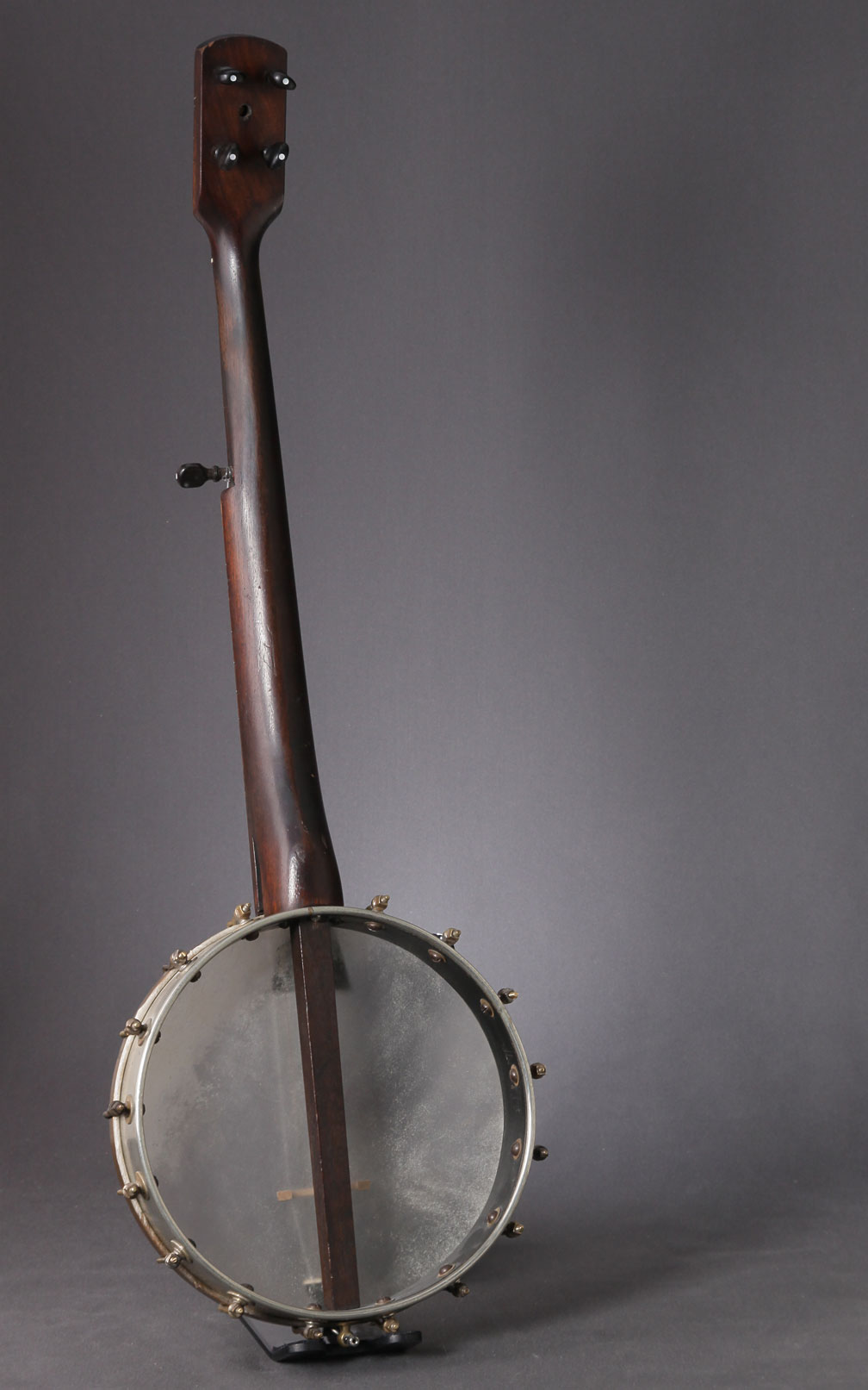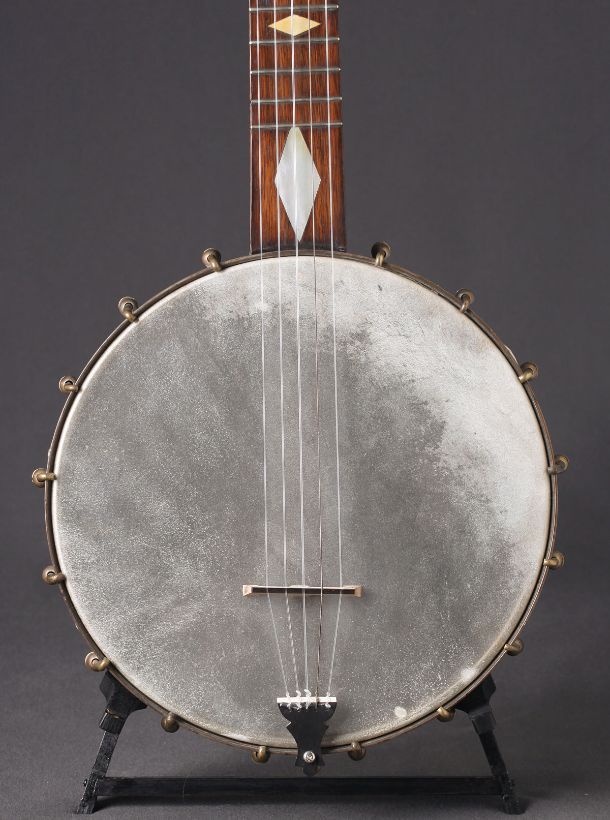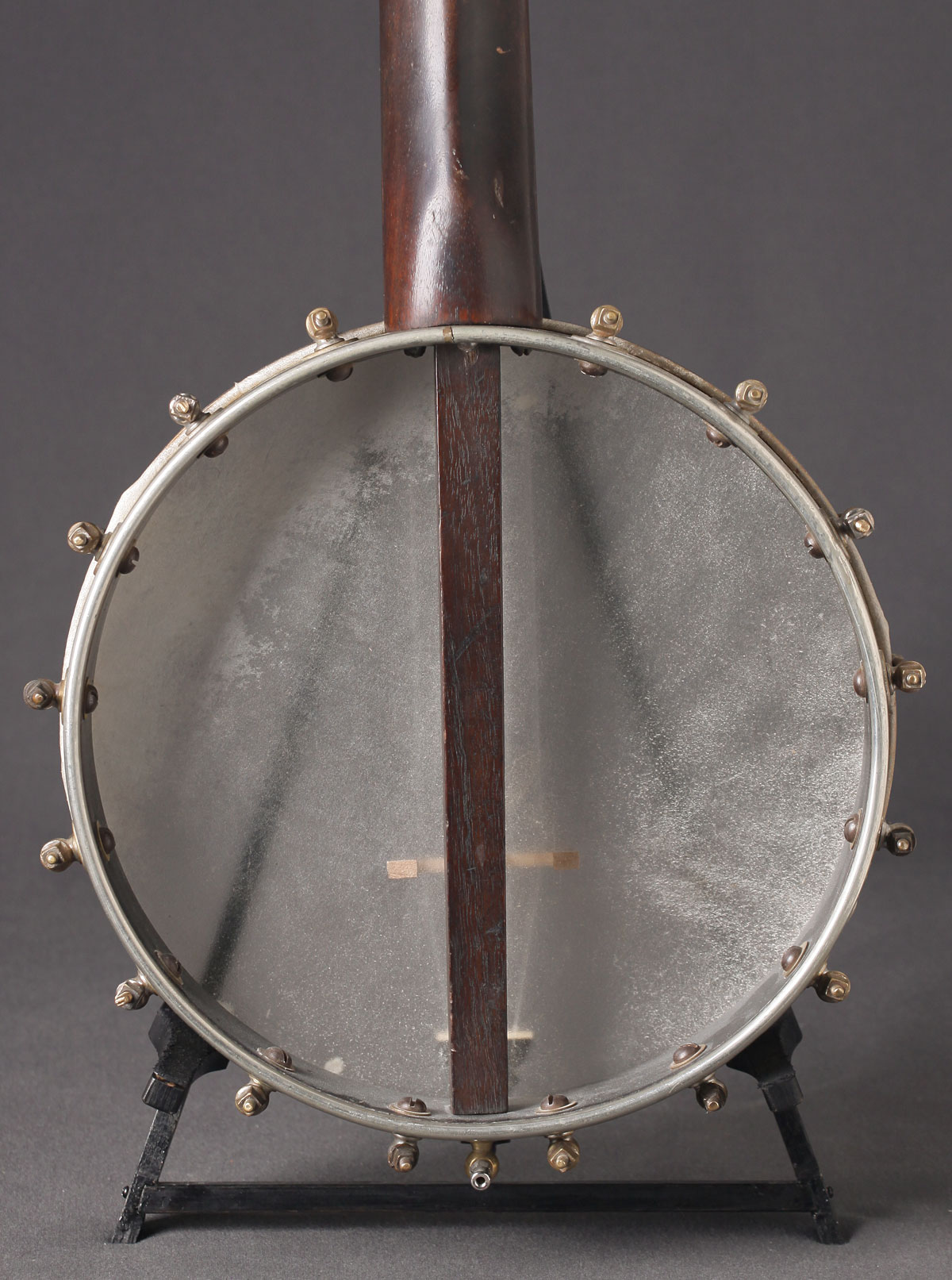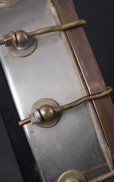 In the second half of the 19th Century there began to appear factory-made early versions of modern banjos with metal frets. Many of these new banjos had spun aluminum (a very expensive commodity at the time) pots. We have some actual photos of one of these early modern banjos dated to somewhere in the the 1860s or 1870s. It probably had fewer brackets when it was new, and upgraded at a later unknown date.