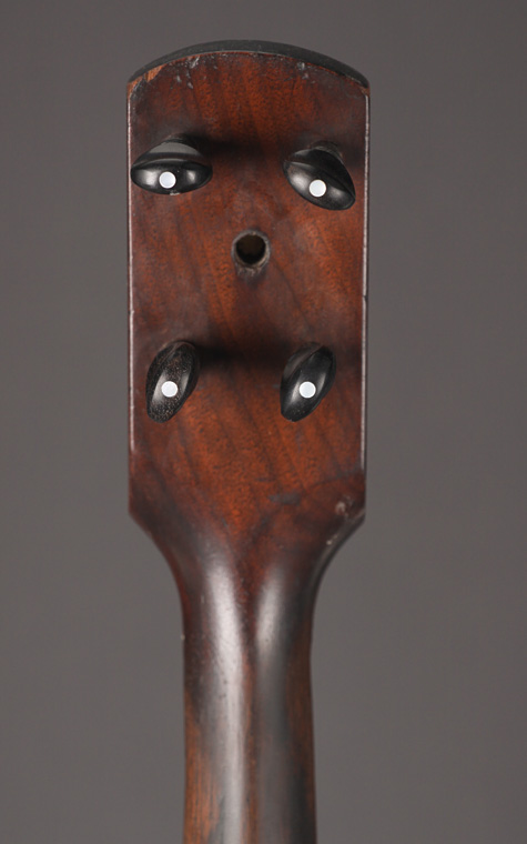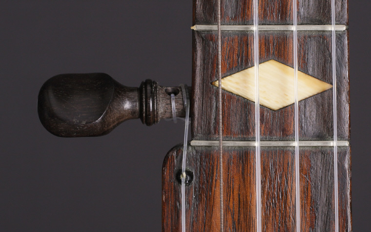 Note in the last photo the extra peg hole in the middle of the peg head. You cannot see the extra hole from the front because it is covered by a large diamond-shaped inlay, installed later in the life of this banjo.