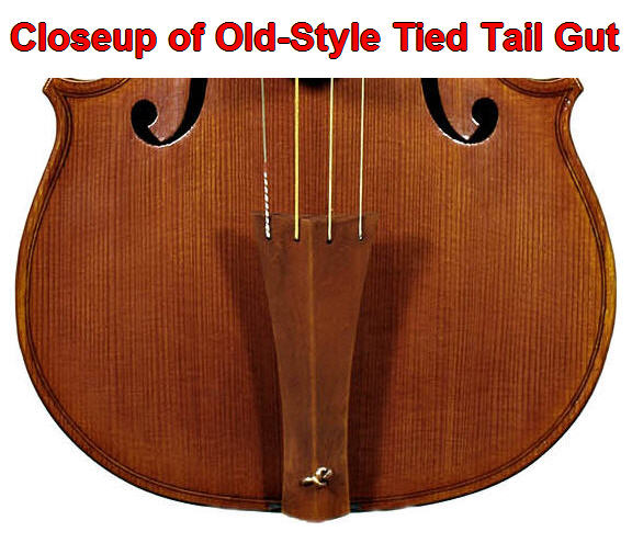 Tail guts of twine saturated with varnish or resin were also used; however, genuine gut continued to be favored. Tail guts, regardless of their composition, were tied to the tailpieces of Baroque and Modern violins for centuries, as shown in the photos of an early Modern violin below.