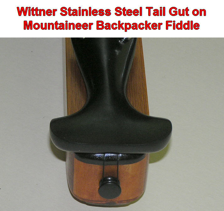 There have been other makers of metal tail guts; however, two German companies, Wittner and Infeld-Thomastik, both make excellent stainless steel tail guts. The metal ones tend to be called "tail hangers" or "tail wires". Stainless steel tail guts are VERY thin, but do not stretch much at all. The photo below shows a Wittner stainless steel tail gut on one of our Mountaineer Backpacker Fiddles.