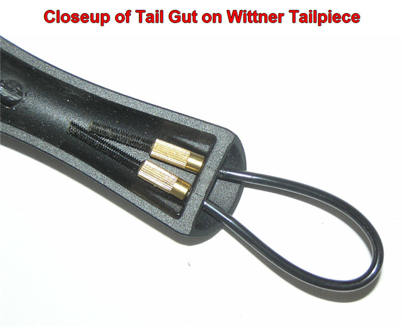 The modern nylon tail guts are threaded at their ends and are attached to a modern tailpiece with adjustment screws (see the photo below). They stretch a lot during break-in, requiring readjustment.