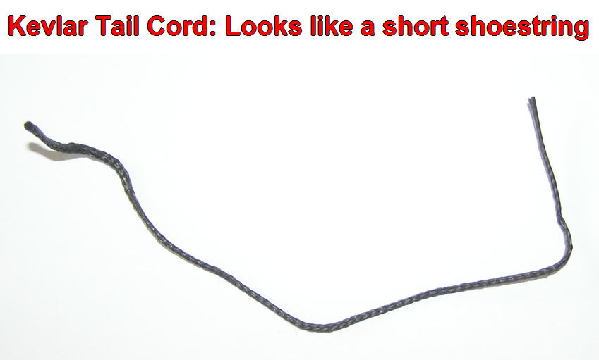 A Kevlar tail cord looks like a short length of waxed dress shoe string. We get ours from Dov Schmidt. See the photos below.