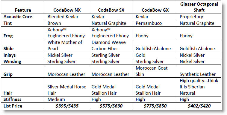 I will return to a comparison of the various “race horse” bows from CodaBow and Glasser, but let’s take a look at feature and cost comparisons first.