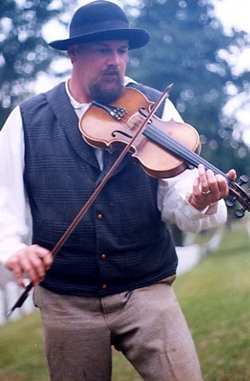 Fiddles used during the Civil War would not have been fitted with either a chin rest or a shoulder rest (not invented yet), yet one sees both used by some re-enactors. The images below show an actual Civil War fiddle in the National Museum of Music and one of the finest Civil War re-enactor fiddlers on Earth, Troy Parker of the 1st NC Volunteers (we’ll allow him the indulgence of fine-tuners on his otherwise perfectly set-up fiddle and great skill in the period playing styles)