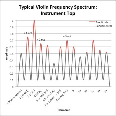 A frequency spectrum graph of the sound emanating from a violin top is not even close to a graph based on measurement from the bridge tip. See the illustration below, which shows (using the color red) the points at which the overtones actually have higher amplitude than the fundamental.