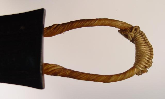 The most significant difference from a modern tailpiece is the attachment method. Thick gut cord is threaded through two holes through the tailpiece near its base. The cord is either knotted or the two ends are joined using a technique known today as the “Stradivari stitch”. The photos below show tail gut tied in this manner.