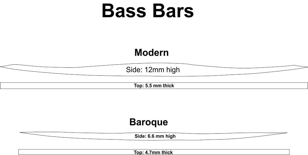 A Baroque bass bar is shorter, lower and thinner than a modern one. There are no standard measurements, Baroque bass bars, and even their location within the instrument, varied by maker. Some measurements of actual original bass bars, listed below, provide some general guidelines.